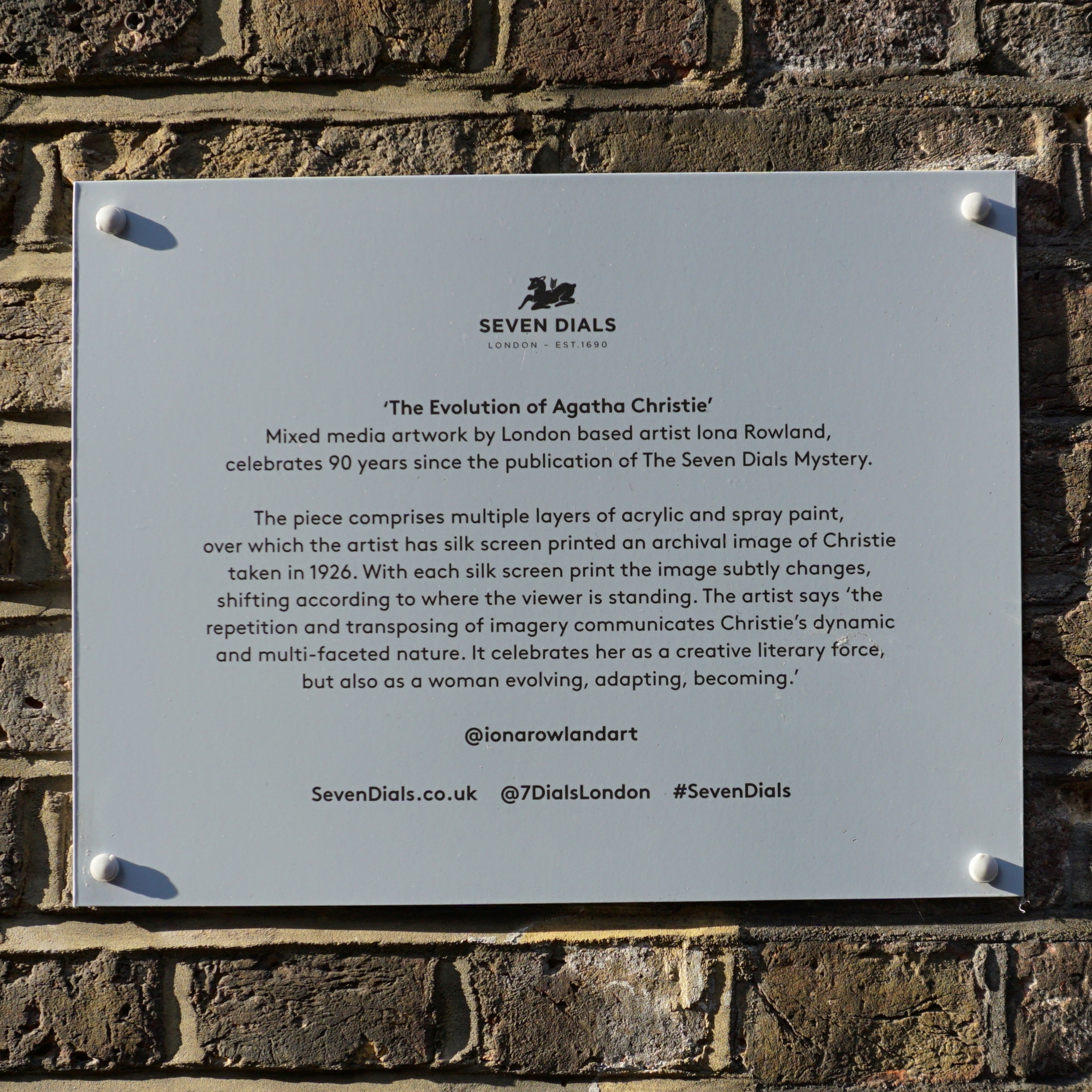 On 17 January 2019 explained that this "specially commissioned, Christie-themed piece of art by Iona Rowland .. showcased on a billboard on Shorts Gardens" was part of a PR bonanza: "special events, including a secret book trail, with 90 books hidden around the streets and free for their finders to keep. Shops and restaurants will be joining in on the fun with special discounts and events."