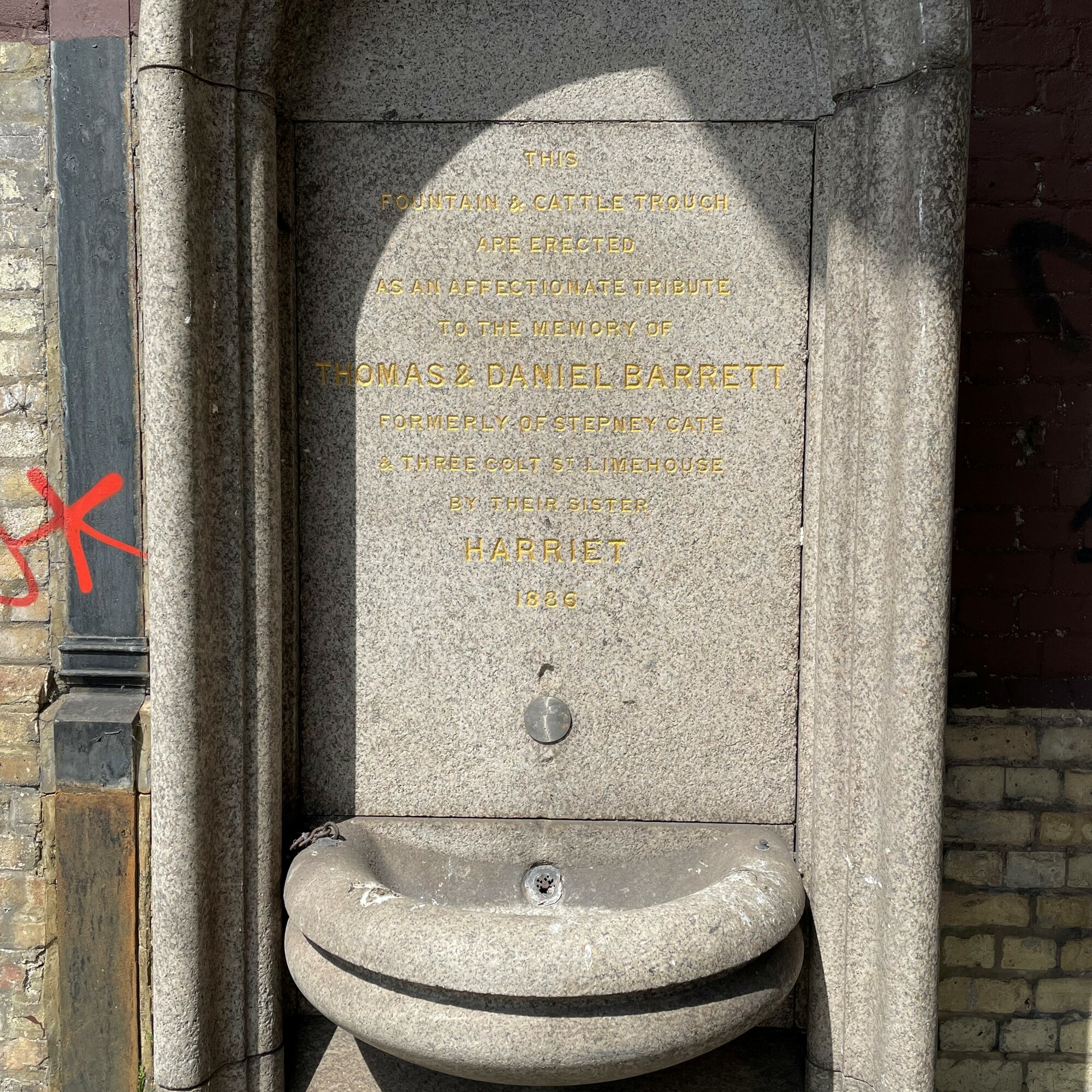 This fountain & cattle trough are erected as an affectionate tribute to the memory of Thomas & Daniel Barrett, formerly of Stepney Gate & Three Colt St. Limehouse by their sister Harriet.