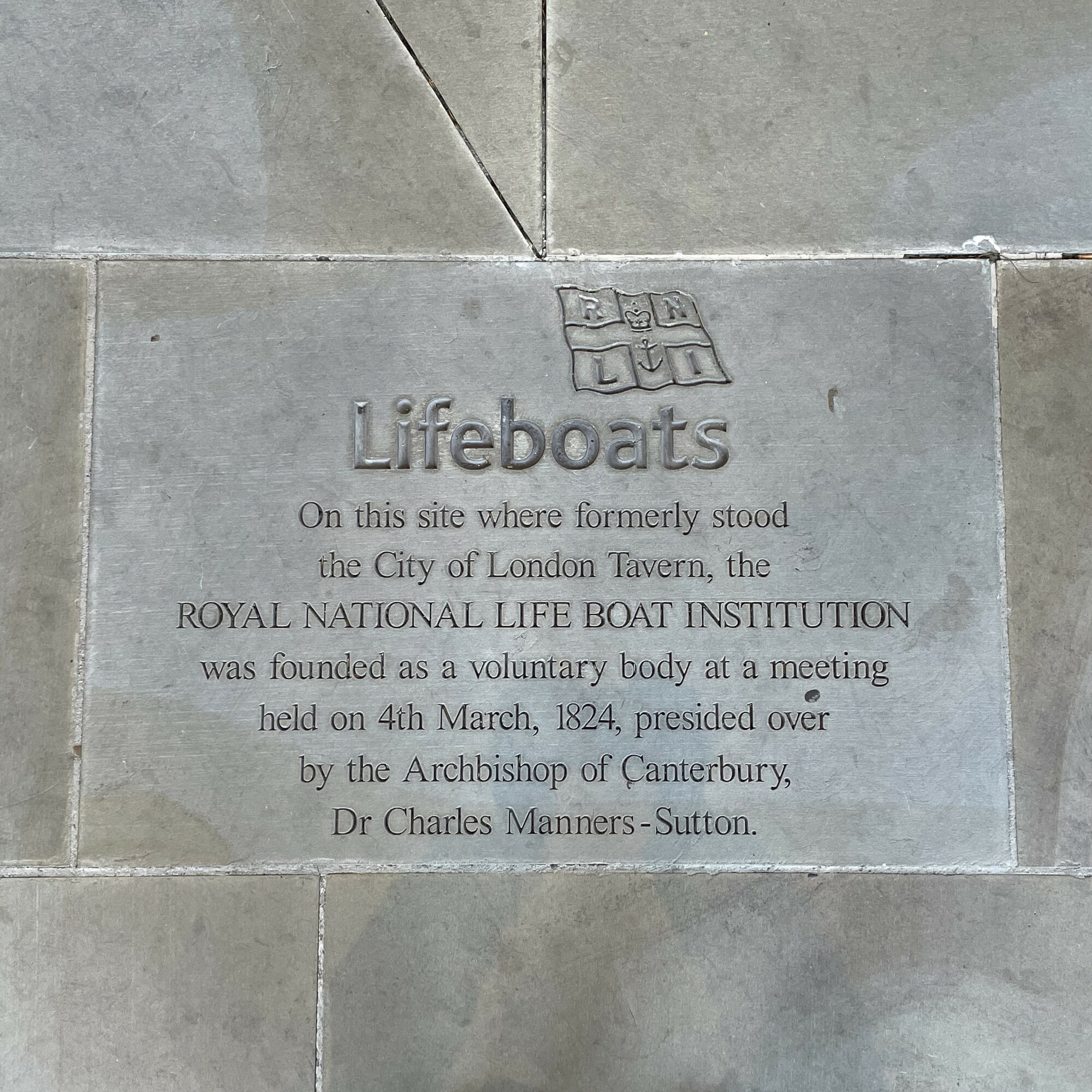 On this site, where formerly stood the City of London Tavern, the Royal National Life Boat Institution was founded as a voluntary body at a meeting held on 4th March, 1824, presided over by the Archbishop of Canterbury, Dr Charles Manners-Sutton.