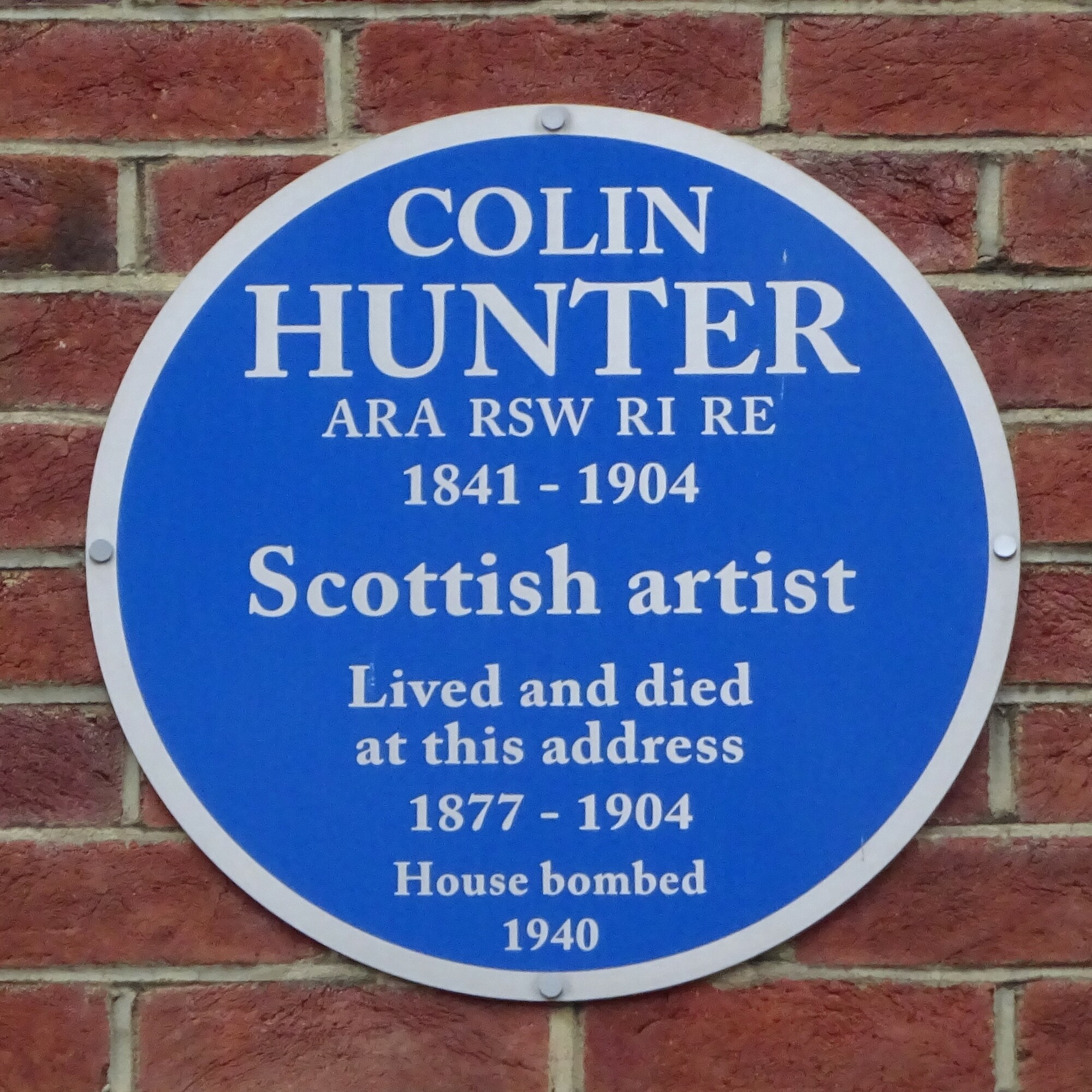 Colin Hunter, ARA, RSW, RI, RE, 1841 - 1904, Scottish artist, lived and died at this address, 1877 - 1904. House bombed 1940.