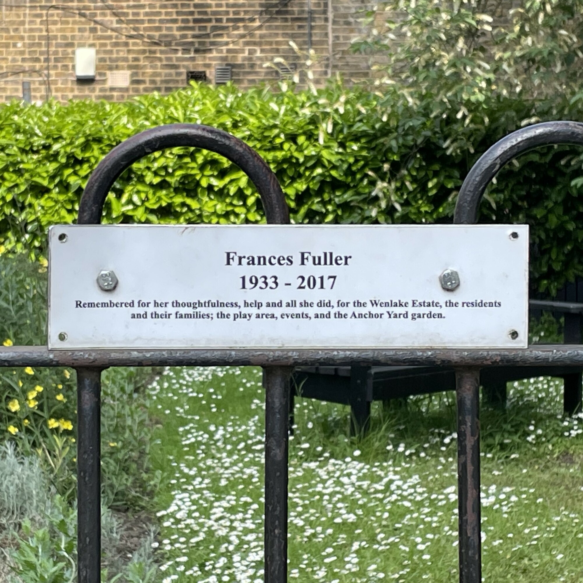 Frances Fuller, 1933 - 2017, remembered for her thoughtfulness, help and all she did, for the Wenlake Estate, the residents and their families; the play area, events, and the Anchor Yard garden.