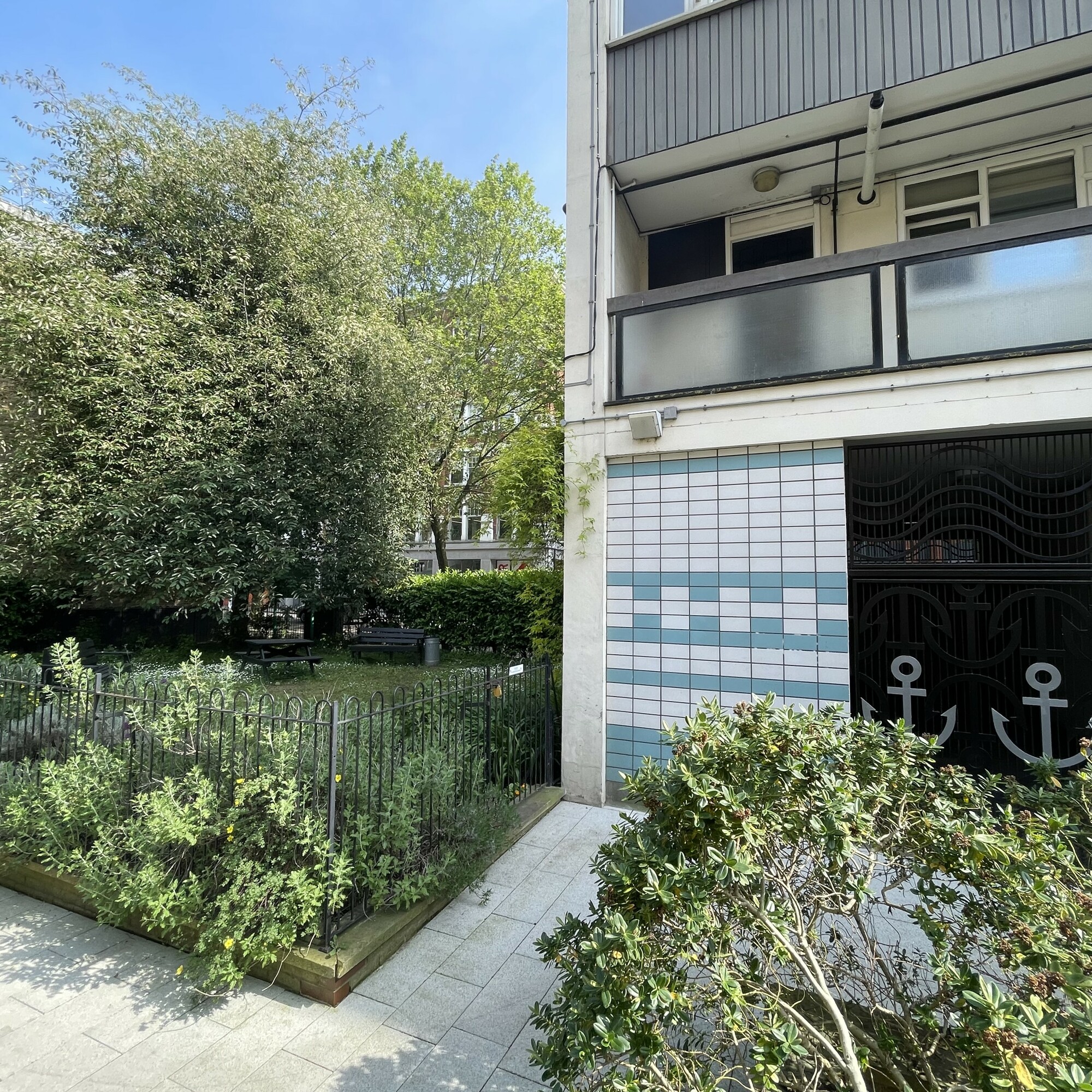 This small plaque can be seen in our photo, to the left of the tiled panel. To the right you can see part of the metal grill with decorative work inspired by the name of this nearby alley, Anchor Yard.