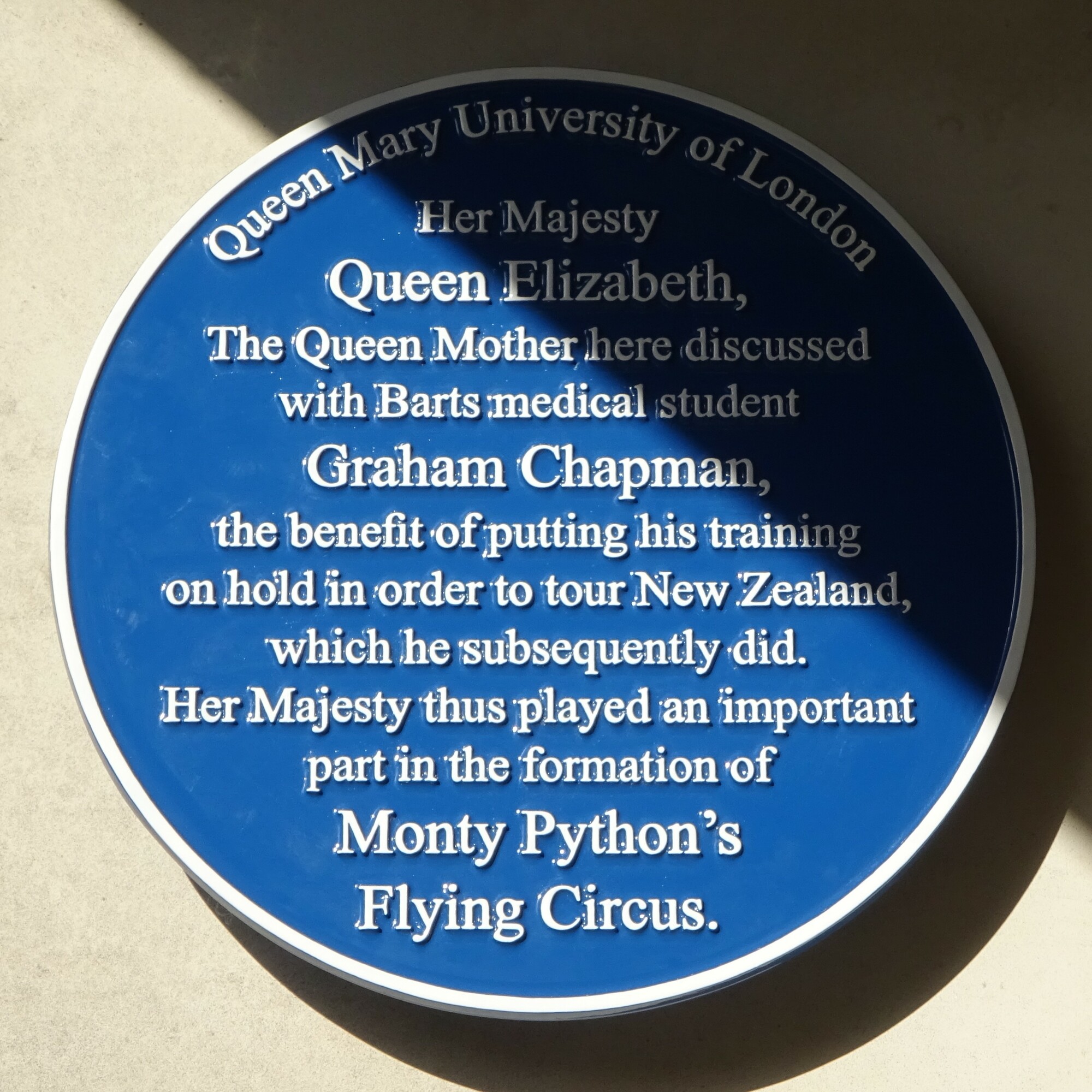 Her Majesty Queen Elizabeth, the Queen Mother, here discussed with Barts medical student Graham Chapman, the benefit of putting his training on hold in order to tour New Zealand, which he subsequently did. Her Majesty thus played an important part in the formation of Monty Python's Flying Circus.