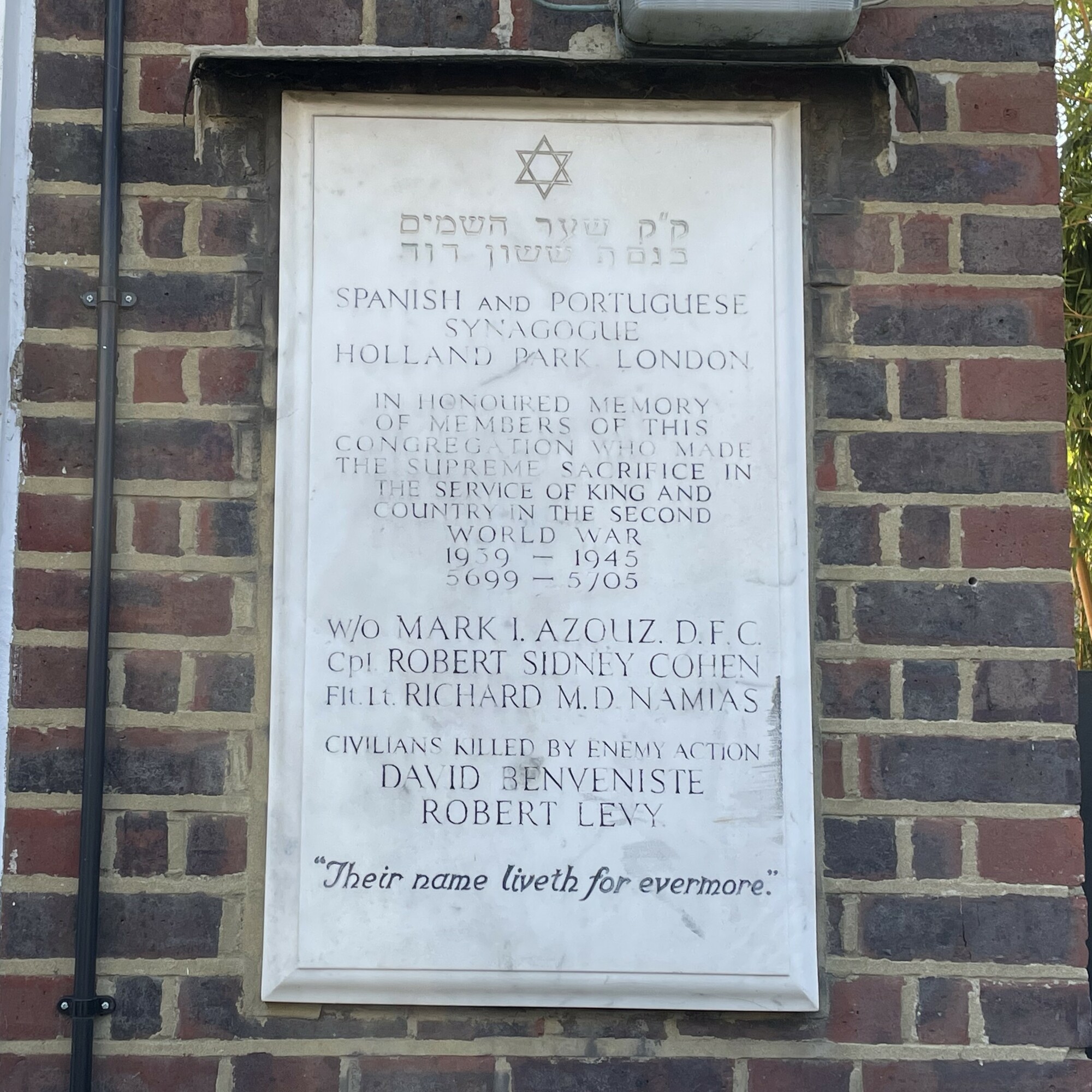 Spanish and Portuguese Synagogue Holland Park, London, in honoured memory of members of this congregation who made the supreme sacrifice in the service of king and country in the second world war, 1939 - 1945: