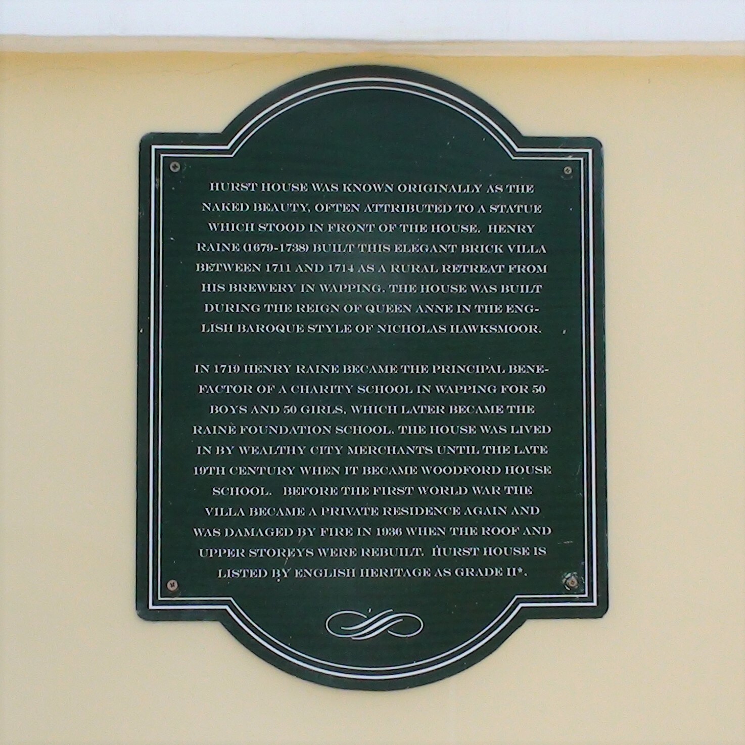 In 1719 Henry Raine became the principal benefactor of a charity school in Wapping for 50 boys and 50 girls, which later became the Raine Foundation School. The house was lived in by wealthy city merchants until the late 19th century when it became Woodford House School. Before the First Wold War the villa became a private residence again and was damaged by fire in 1936 when the roof and upper storeys were rebuilt. Hurst House is listed by English Heritage as Grade II*.