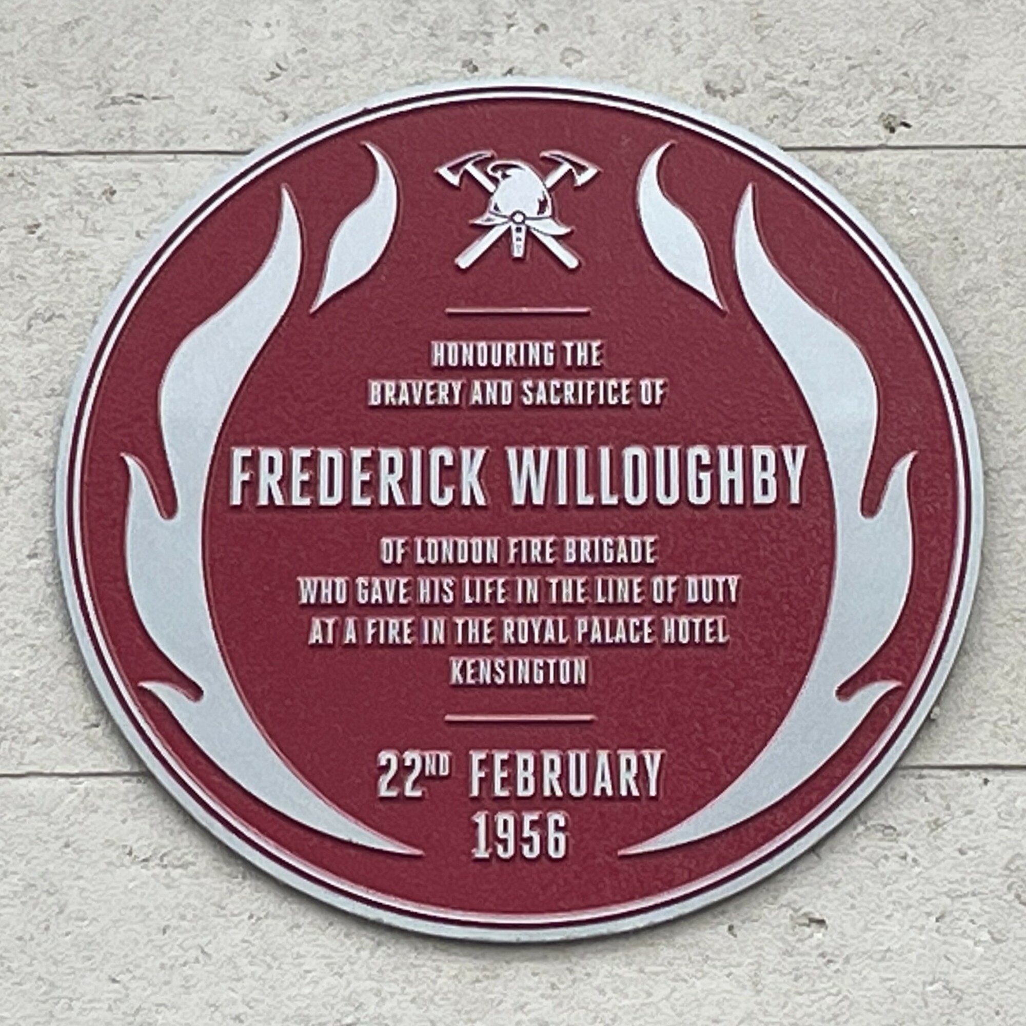 Honouring the bravery and sacrifice of Frederick Willoughby of London Fire Brigade who gave his life in the line of duty at a fire in the Royal Palace Hotel Kensington, 22nd February 1956.