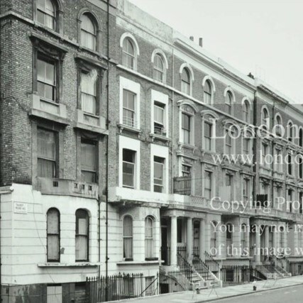 This photo of the house is an extract of a photo we were delighted to find at the wonderful , where it is captioned: "1973. Front elevation of a terrace of Victorian houses at 44-66 Talbot Road, Paddington, with number 66 in the foreground at the corner of {what was then} Moorhouse Road {and is now the Anglebury block of flats}. The houses have four storeys, basements, first-floor balconies and iron basement railings. These houses no longer exist, having been replaced in 1978 by {Anglebury and} Shrewsbury {Road} Gardens." But what is really pleasing is to see the circular mark left by the plaque - on the fourth house from the left, first floor. The Archive have excellent zoom on their images and it's clearer there.