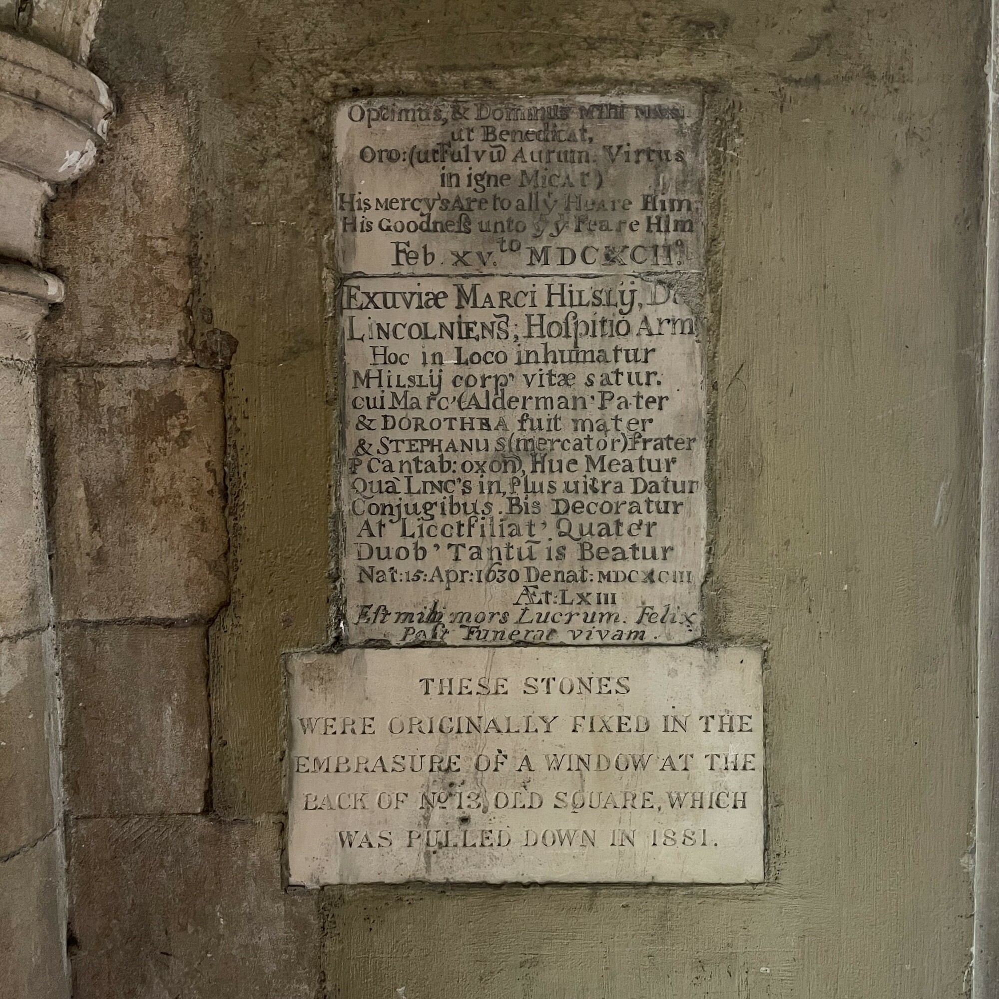 In this place is buried the full mortal remains of M Hilsly whose father was Mark (an alderman) and mother was Dorothy and brother was Stephen (a merchant), ? of Cambridge and Oxford.