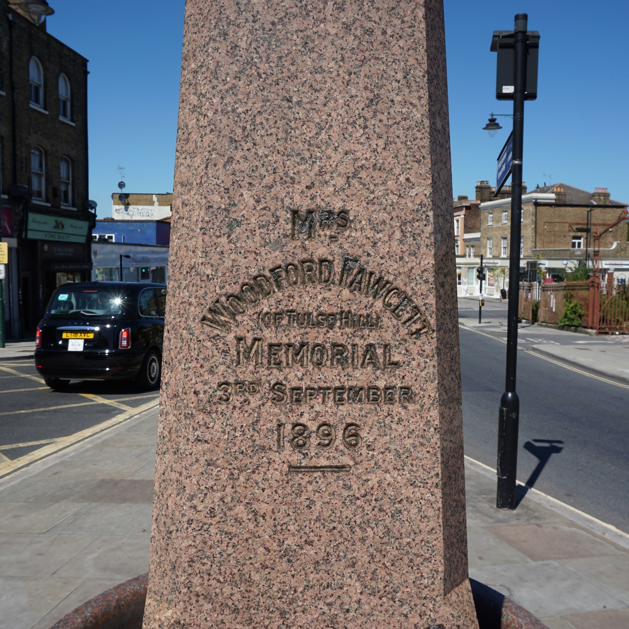 {Front of fountain} Mrs. Woodford Fawcett of Tulse Hill, memorial, 3rd September 1896.