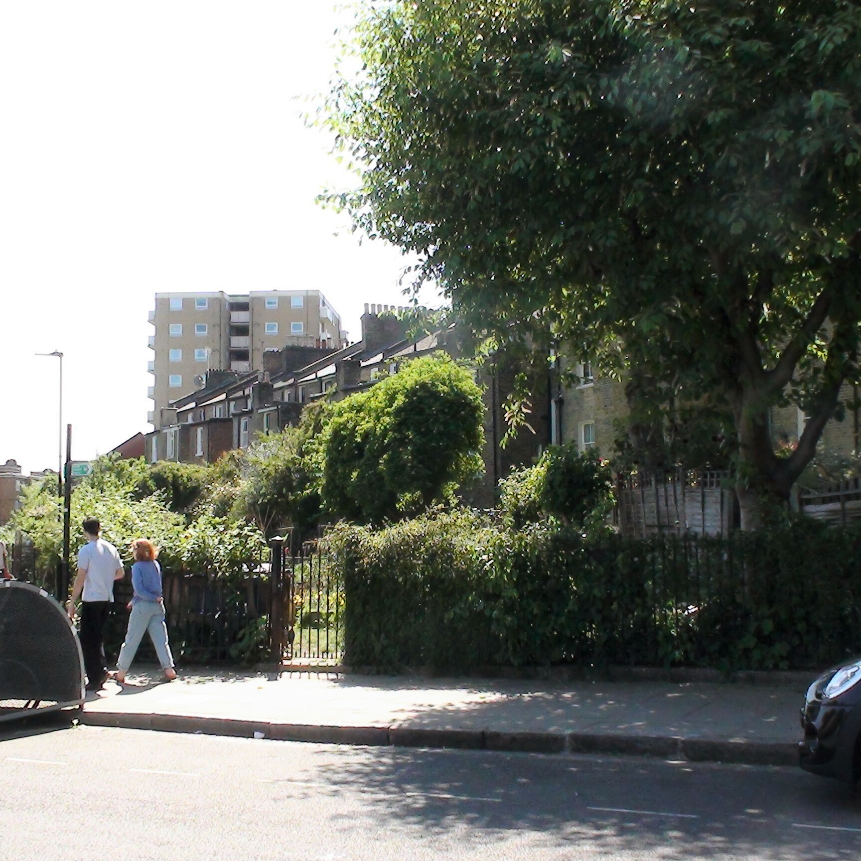 The river has been replaced with allotments. The plaque is lost in the foliage but believe us, it is attached to the railings, between the gate and the tree.
