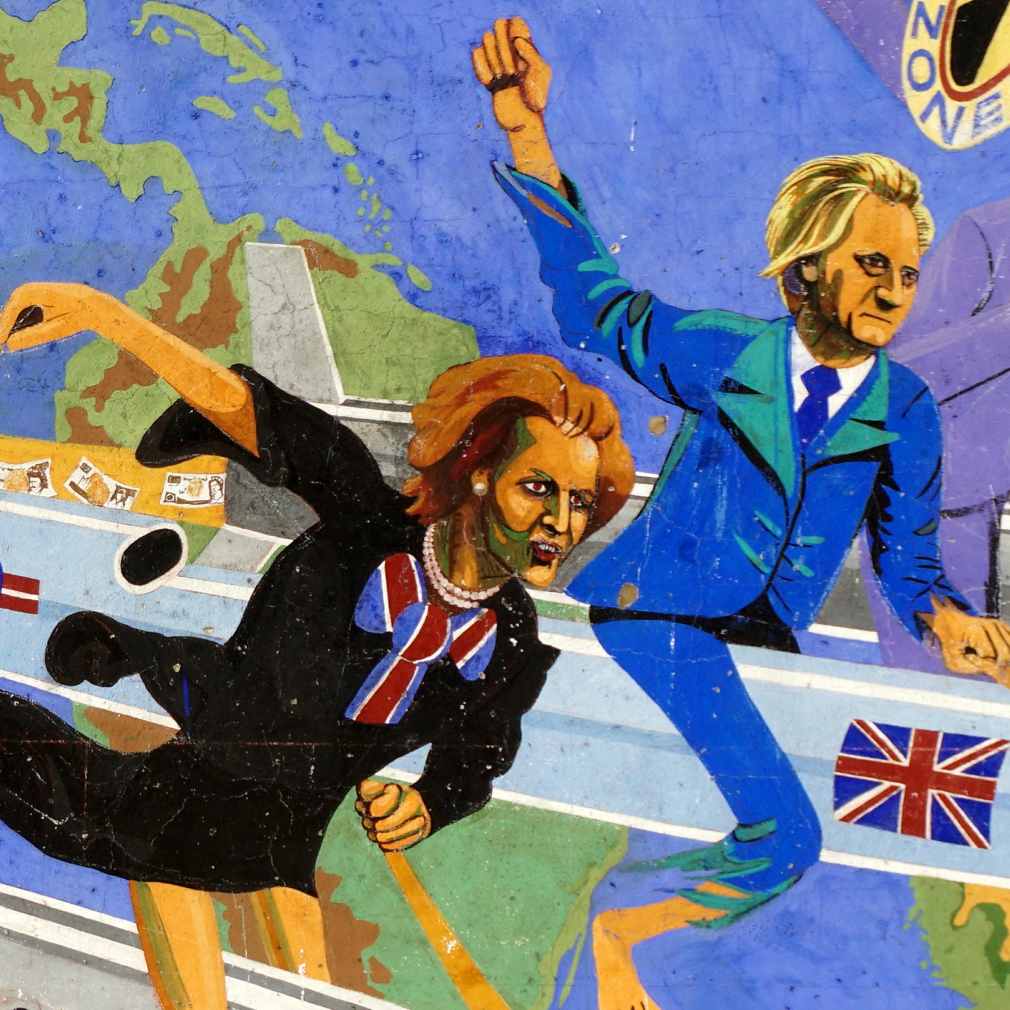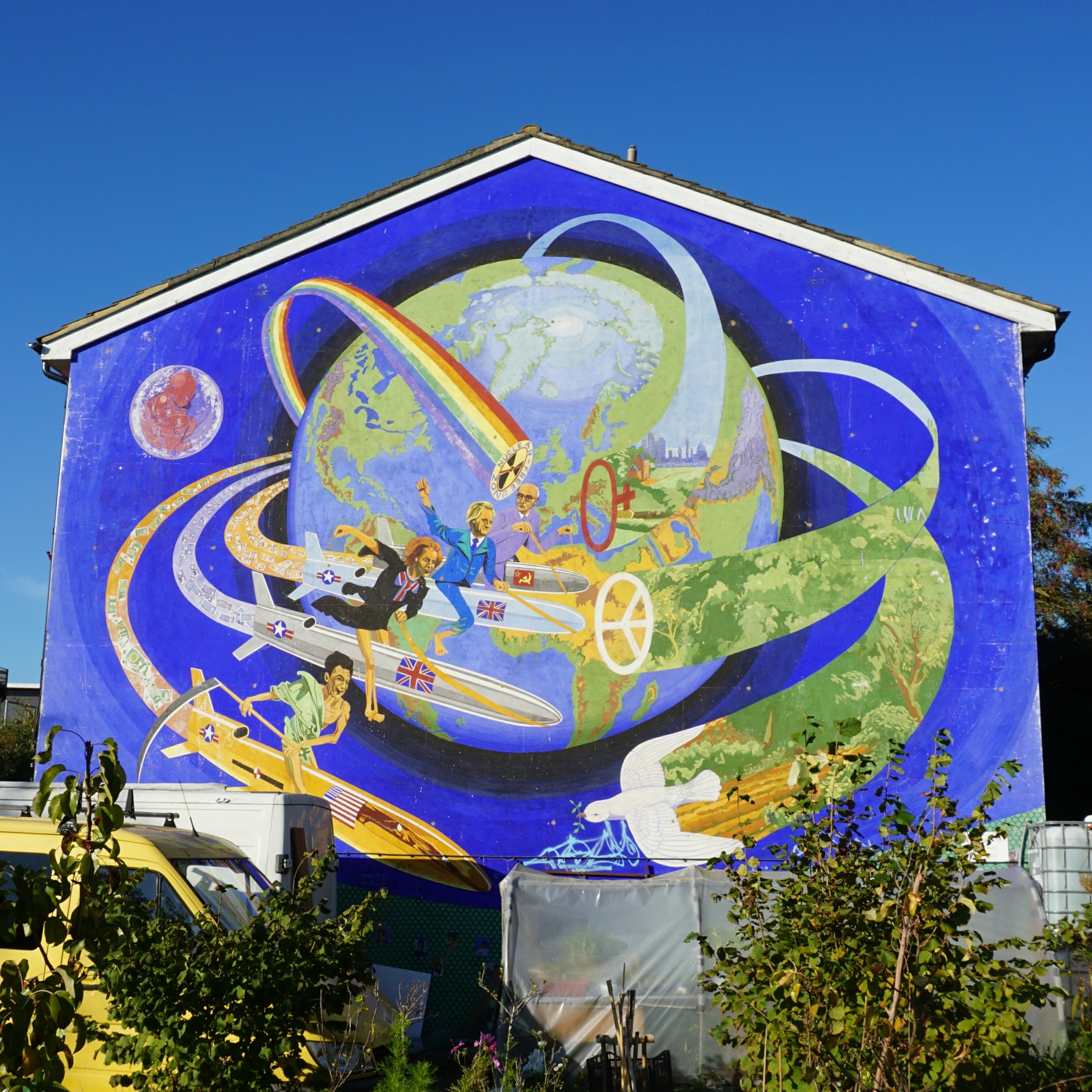The mural features Thatcher, Reagan, Heseltine and Andropov, all astride cruise missiles encircling the globe, being met by a dove and a CND peace symbol. Also whizzing around are the symbols for the female gender and for a nuclear radiation zone.