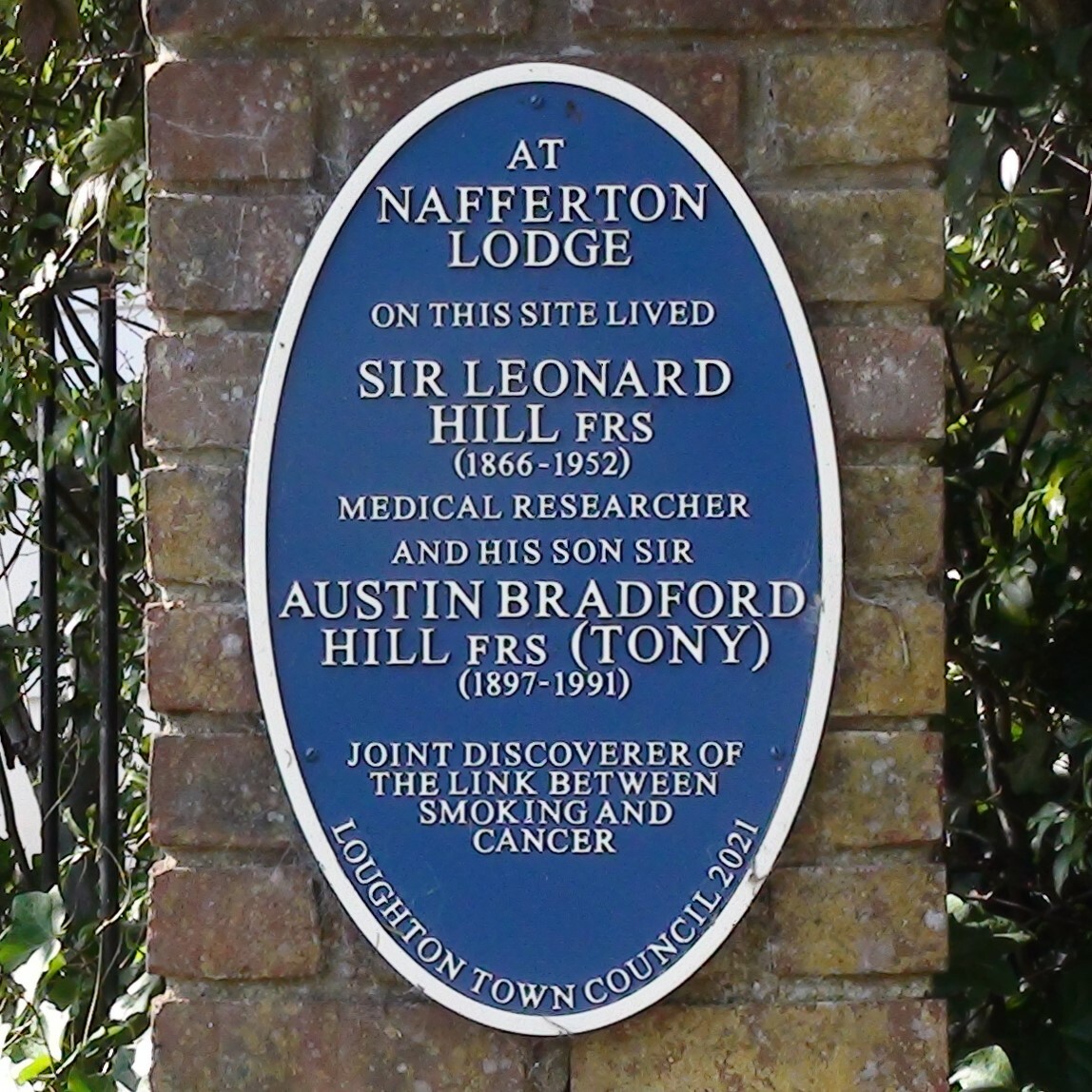 At Nafferton Lodge, on this site, lived Sir Leonard Hill FRS (1866-1952) medical researcher, and his son Sir Austin Bradford Hill FRS (Tony) (1897 - 1991), joint discoverers of the link between smoking and cancer.