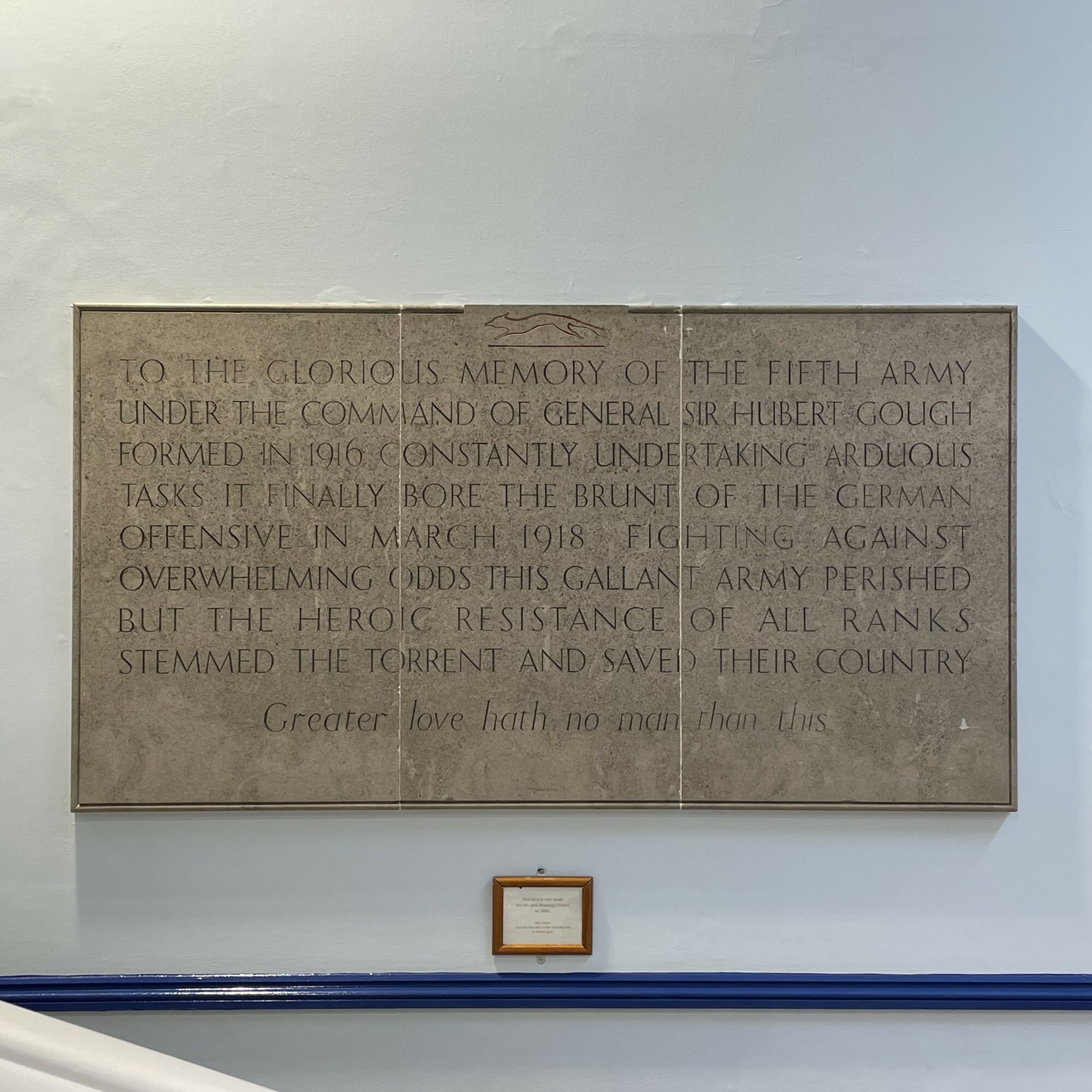 To the glorious memory of the fifth army. Under the command of General Sir Hubert Gough, formed in 1916, constantly undertaking arduous tasks, it finally bore the brunt of the German offensive in March 1918. Fighting against overwhelming odds this gallant army perished but the heroic resistance of all ranks stemmed the torrent and saved their country.