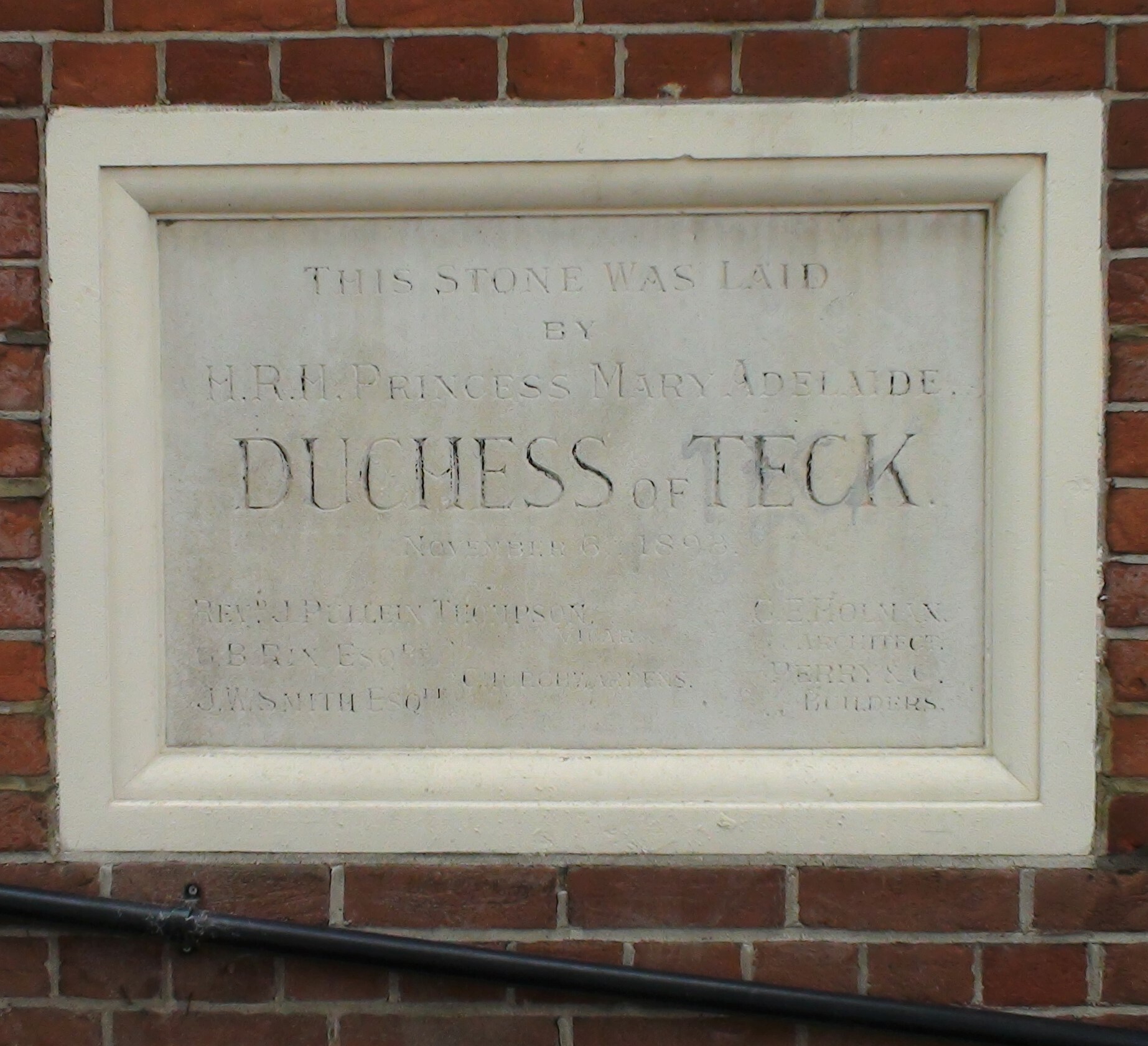 This stone was laid by HRH Princess Mary Adelaide, Duchess of Teck, November 6th 1893.