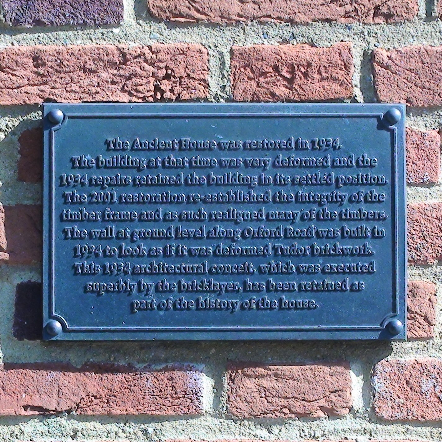 The Ancient House was restored in 1934. The building at that time was very deformed and the 1934 repairs retained the building in its settled position. The 2001 restoration re-established the integrity of the timber frame and as such realigned many of the timbers. The wall at ground level along Orford Road was built in 1934 to look as if it was deformed Tudor brickwork. This 1934 architectural conceit, which was executed superbly by the bricklayer, has been retained as part of the history of the house.