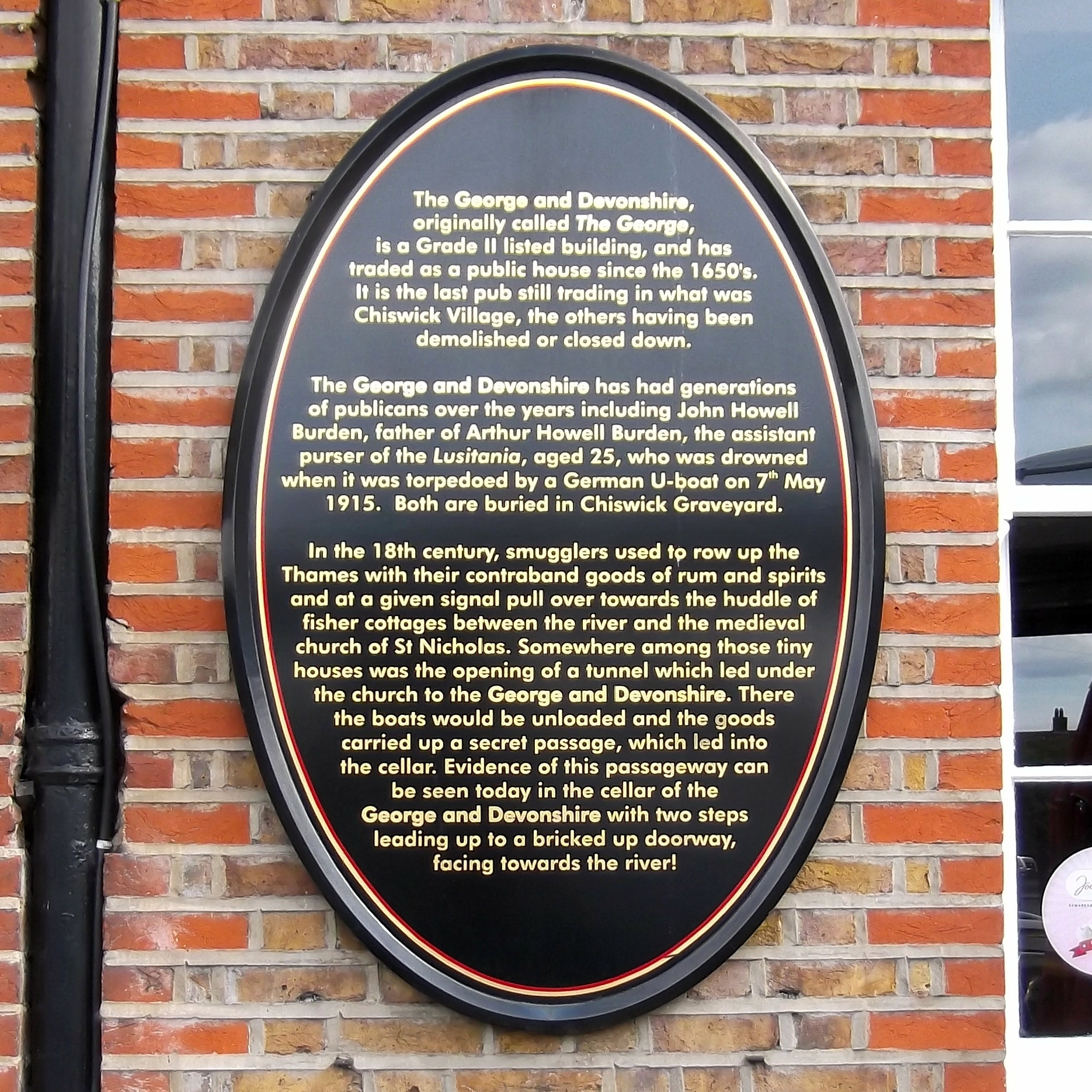 The George and Devonshire has had generations of publicans over the years including John Howell Burden, father of Arthur Howell Burden, the assistant purser of the Lusitania, aged 25, who was drowned when it was torpedoed by a German U-boat on 7th May 1915. Both are buried in Chiswick graveyard.