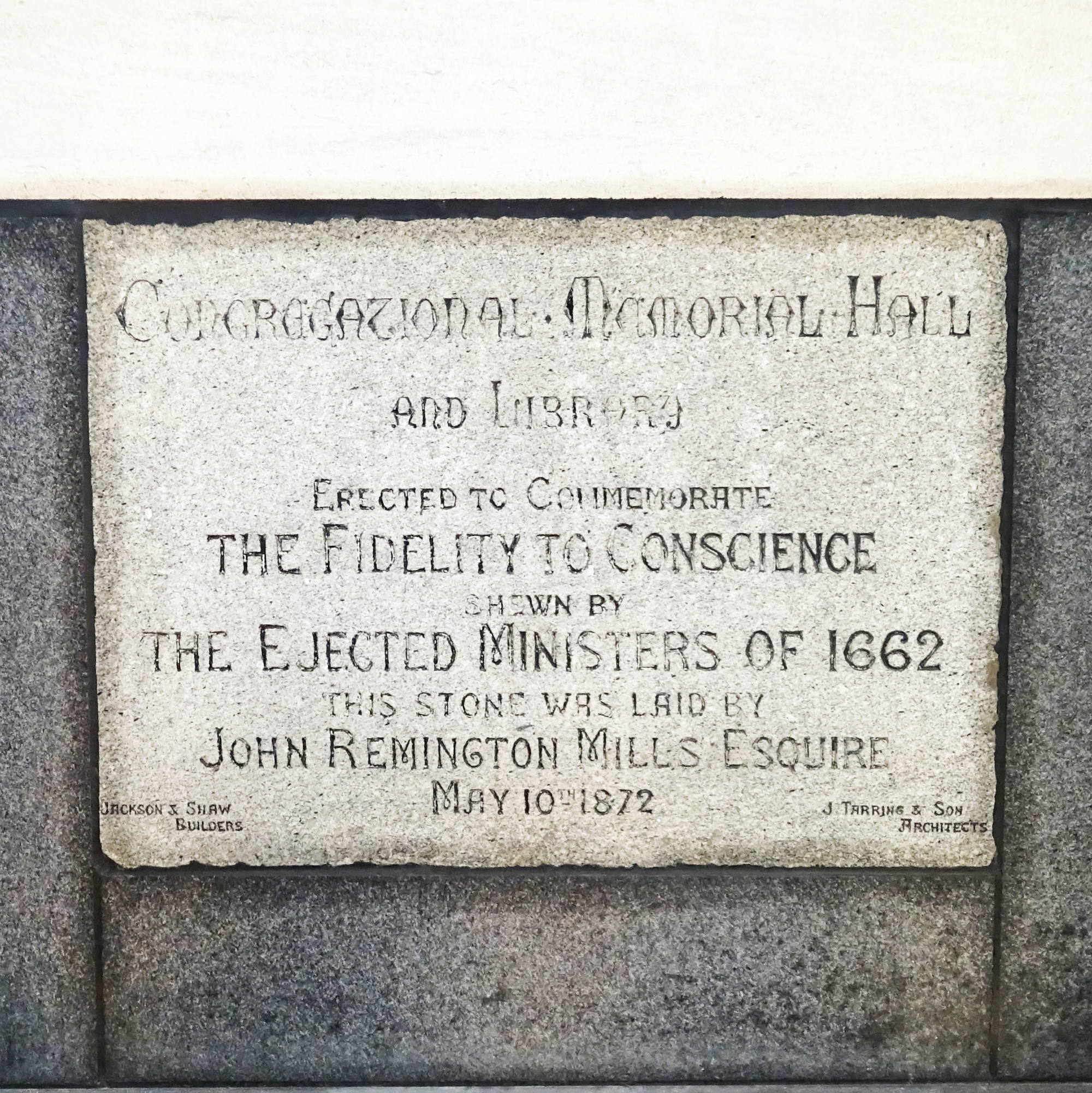 Erected to commemorate the fidelity to conscience shewn by the ejected ministers of 1662, this stone was laid by John Remington Mills Esquire.