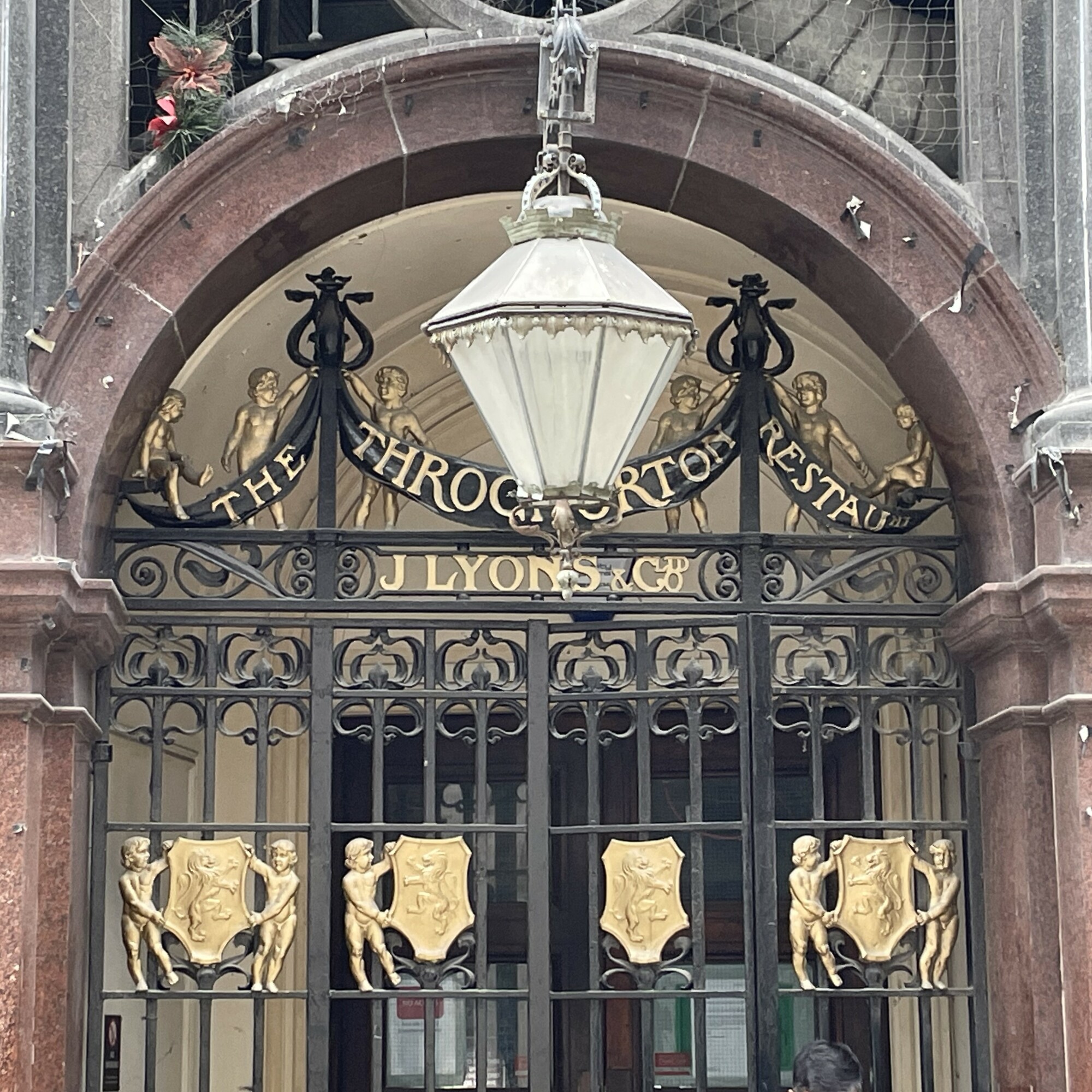 This ornate building has a long frontage on Throgmorton Street, with a number of entrances. Two of them have this decorative ironwork and were originally entrances to the Throgmorton Restaurant. One is in our photo, above the lady with the white skirt, the other is outside the photo, to the right. The road is too narrow to allow for a photo showing the whole building.