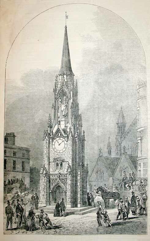 The foundation stone was laid by T. B. Simpson, Treasurer to the Commissioners for Lighting the West Division of Southwark. The ceremony was ‘followed by an excellent dinner at the Bridge House Hotel’. The Tower was completed that same year, except for the statue for which funds were never found.
