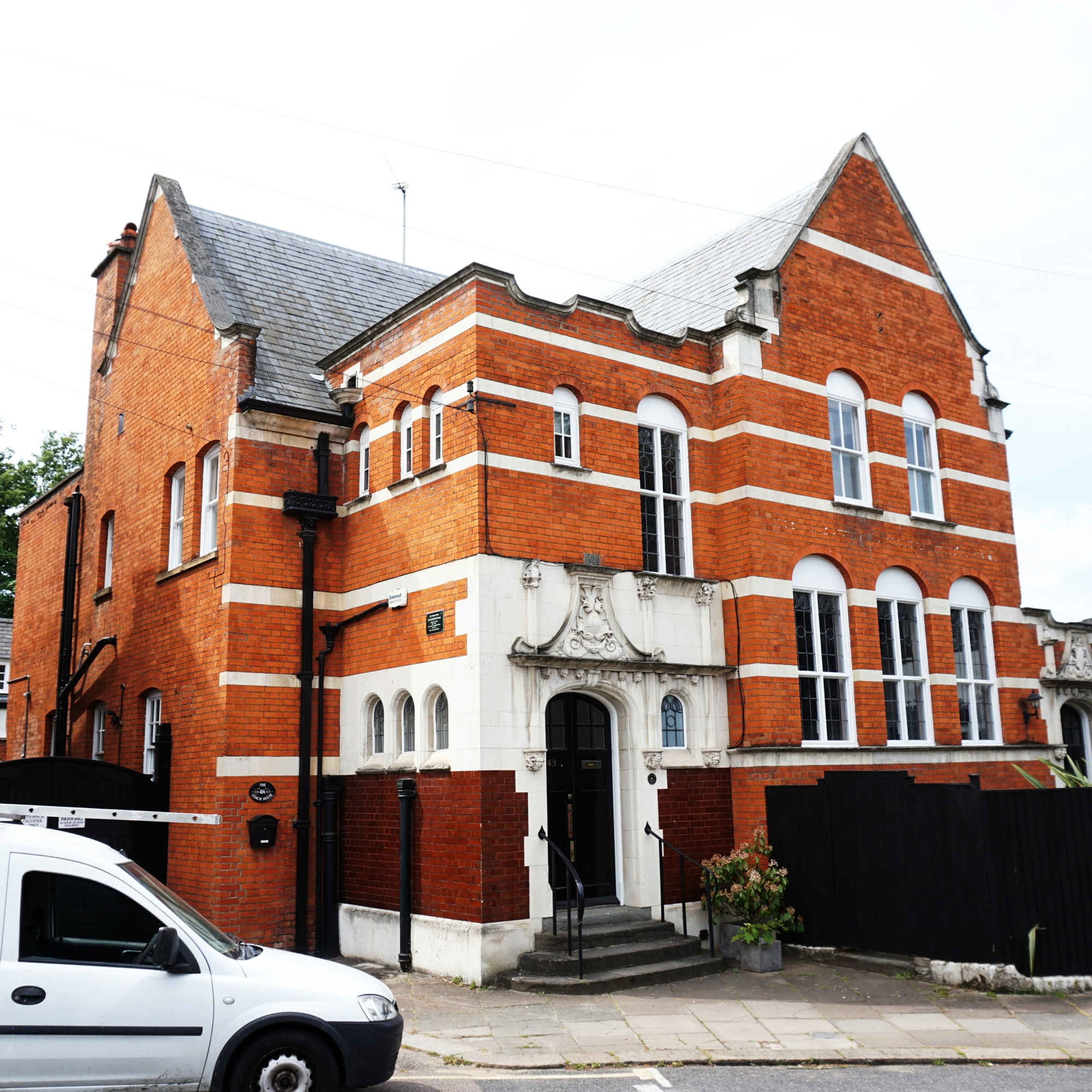 The plaque is on the brick section above the three windows in the white part of the wall, to the left of the door.