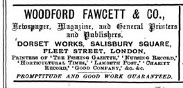 Woodford Fawcett had the address 30 Southampton Street, Strand and died at 41 Grove Lane, Kingston on Thames. Woodford Fawcett & Co printed the Optical Magic Lantern Journal (1889–1903) for the first three years of its publication, until a fire at their (the printers') premises in 1892, their business address being Dorset Works, Salisbury Square, London EC. In 1888 the firm printed about "Earlswood Idiot Asylum".