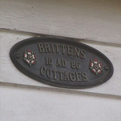 These buildings have been very thoroughly researched at , whence comes this photo of them before their 1892 restoration. Possibly originally constructed as a barn, although the double storey construction may contradict this. Named for the Britten family (formerly Bretaigne) who first established themselves in the York Hill area in 1585 when they leased the cottages at the junction of York Hill and Pump Hill, today known as "Brittens Cottages".