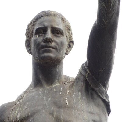This bronze nude warrior is far more focussed on proudly raising a flaming cr...